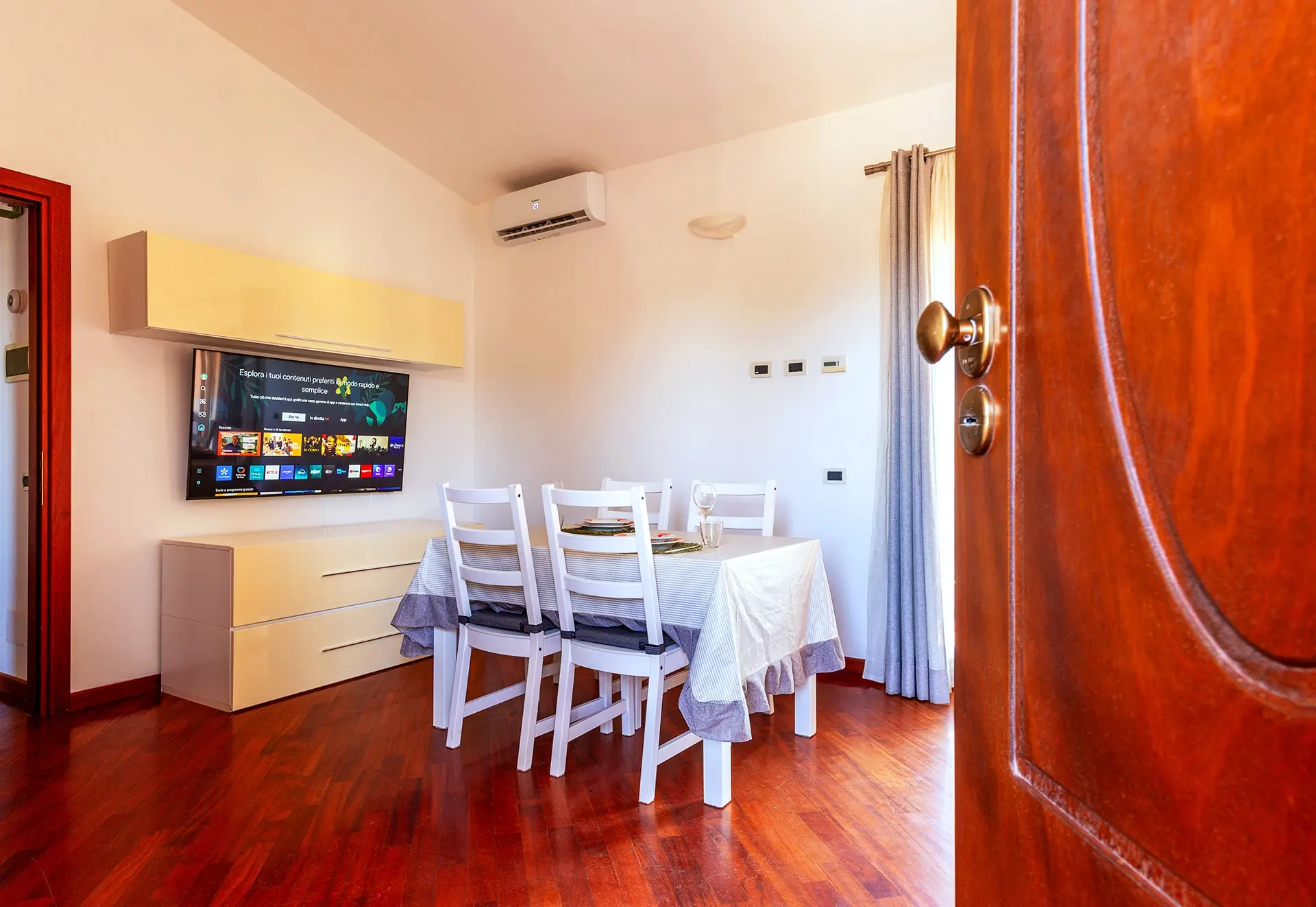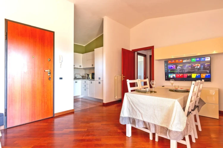 Zona giorno open-space con divano, smart-TV 55″ Thoshiba 2025 e tavolo da pranzo con 6 sedie.