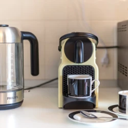 Cucina completamente attrezzata: piano cottura a gas whirlpool, forno elettrico 6 senso whirlpool, forno microonde, macchina caffè Nespresso, tostapane, bollitore.